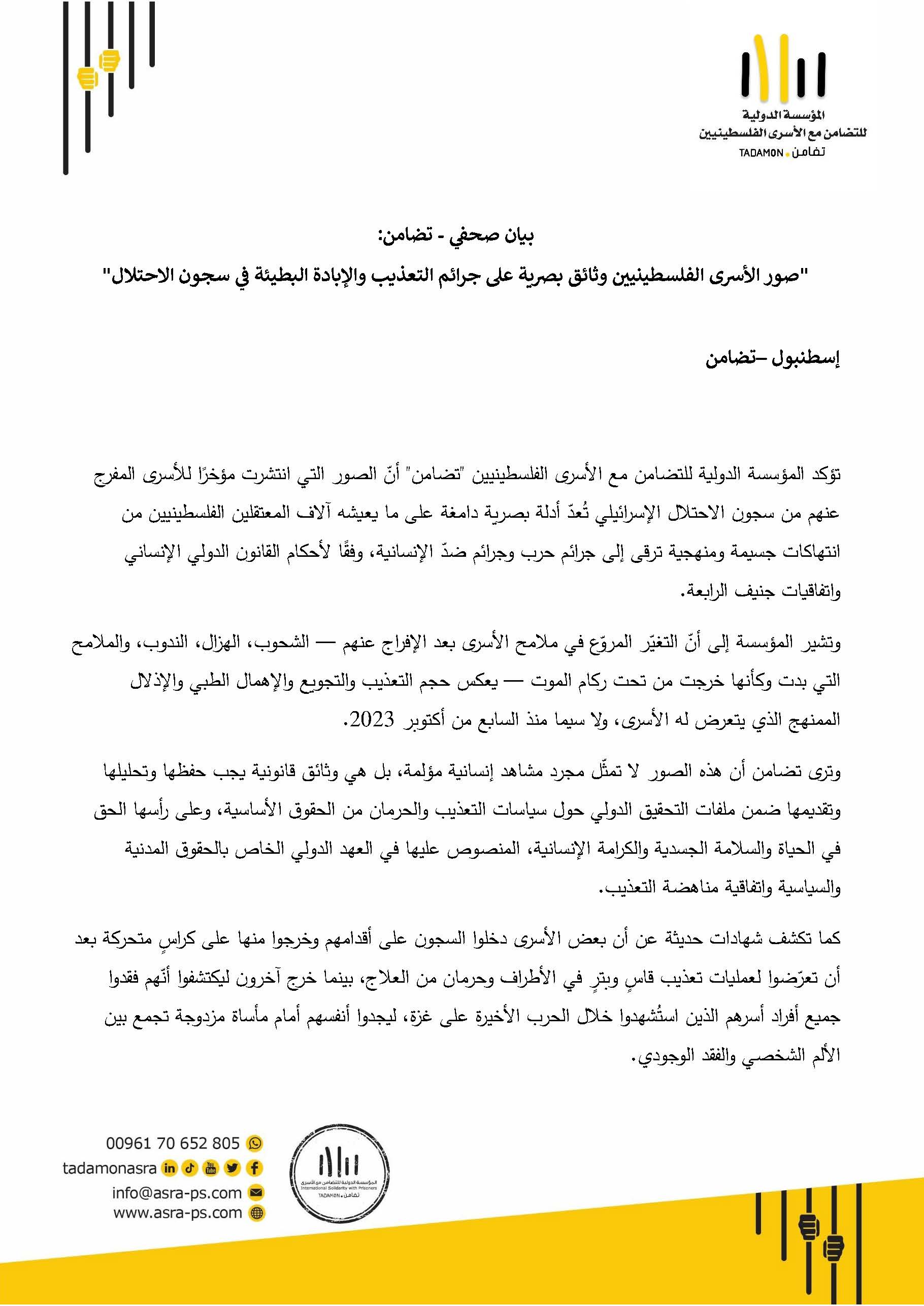 بمناسبة الذكرى الثانية لحرب الإبادة على غزة صادر عن المؤسسة الدولية للتضامن مع الأسرى الفلسطينيين (تضامن)
