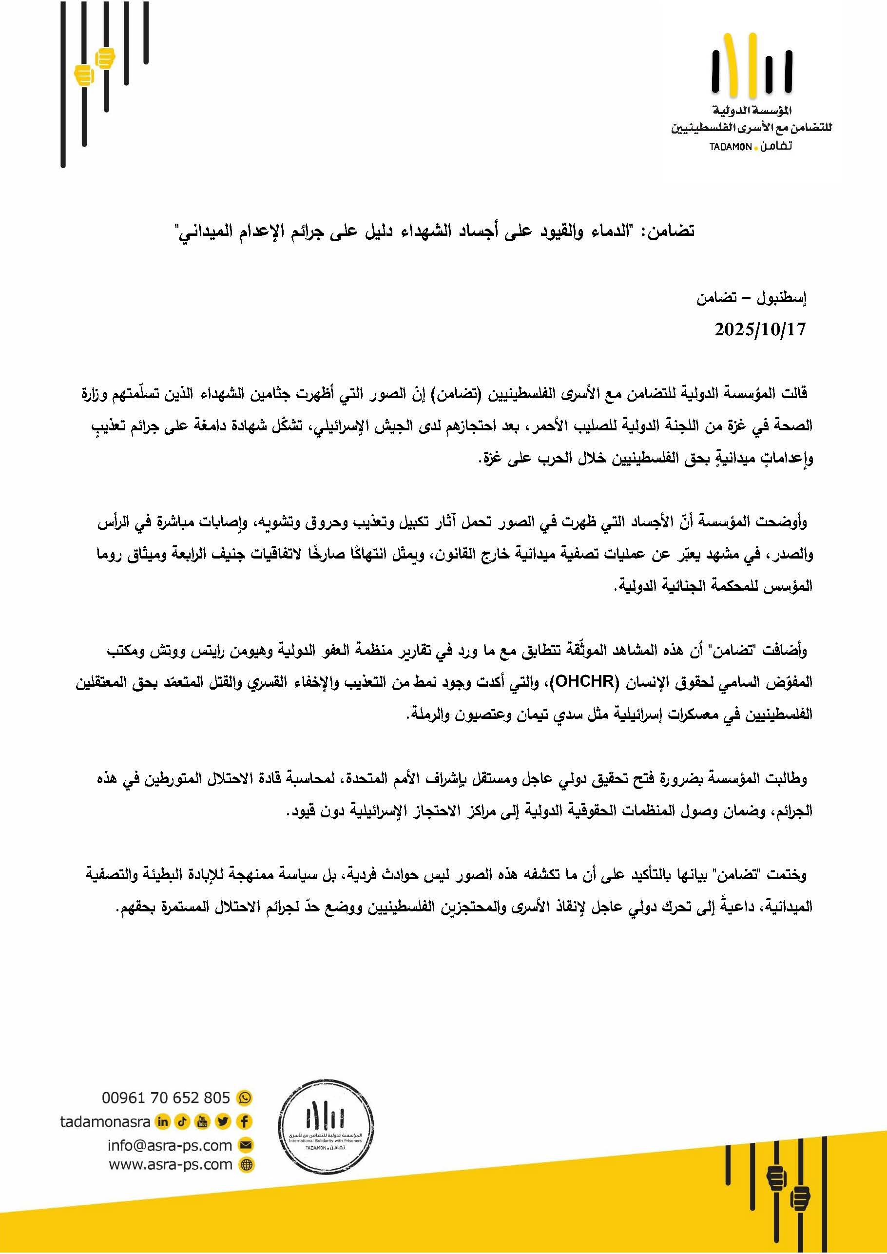 بمناسبة الذكرى الثانية لحرب الإبادة على غزة صادر عن المؤسسة الدولية للتضامن مع الأسرى الفلسطينيين (تضامن)